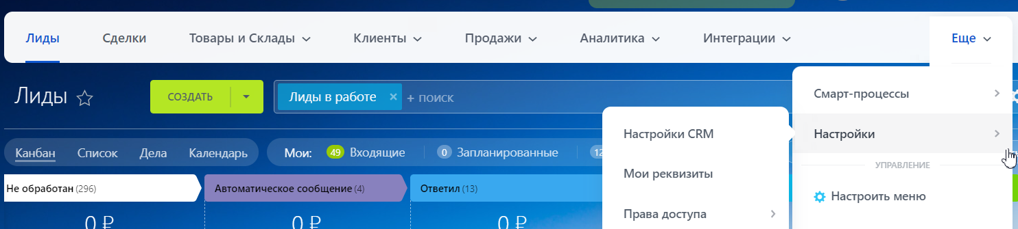 1. На главной странице нажмите «Еще» — «Настройки» — «Настройки CRM».