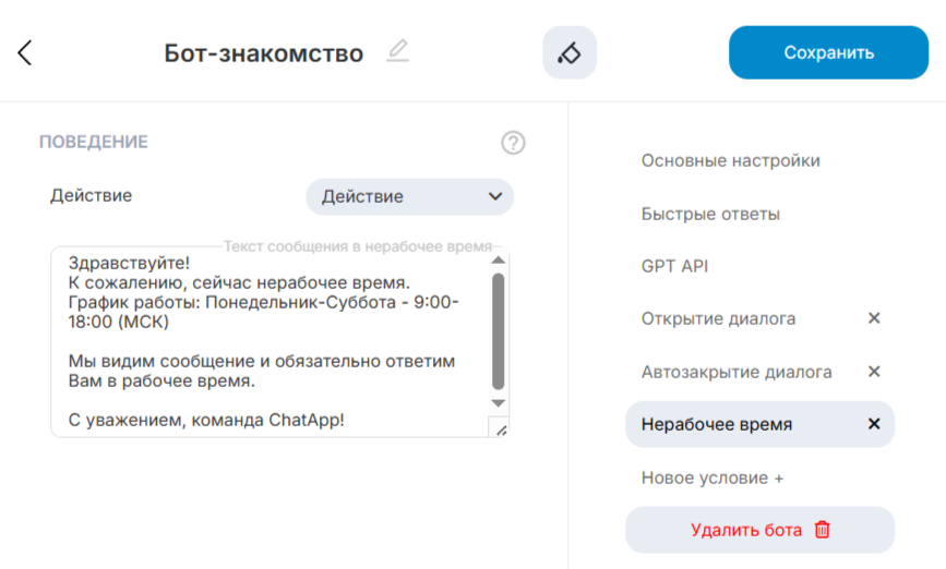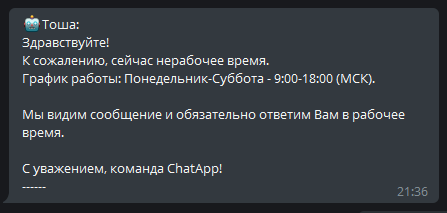 Сообщения в нерабочее время в Готовых сценариях Конструктора ботов