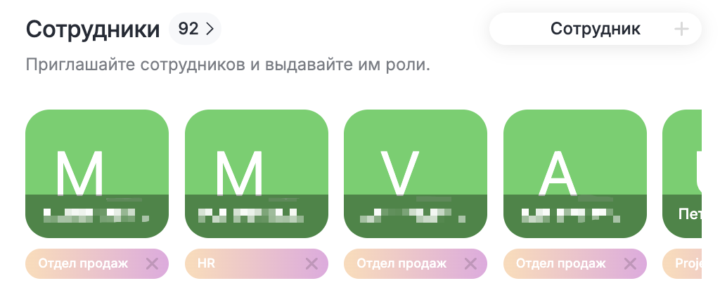 Приглашённые сотрудники отображаются в разделе Сотрудники, а права доступа будут применены согласно роли.