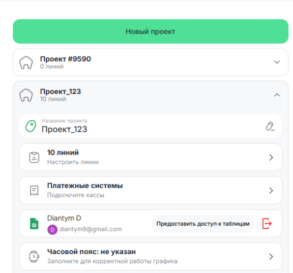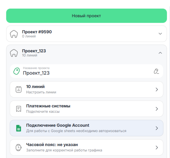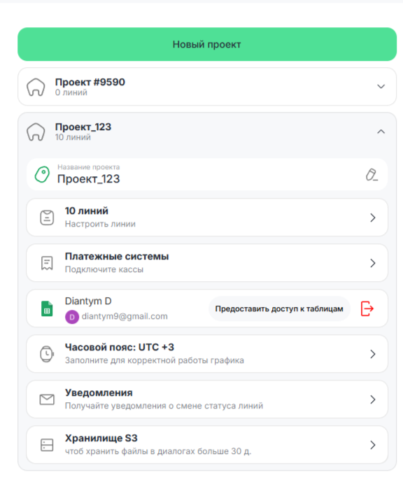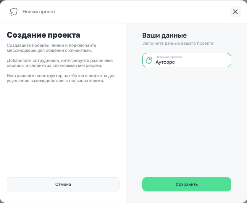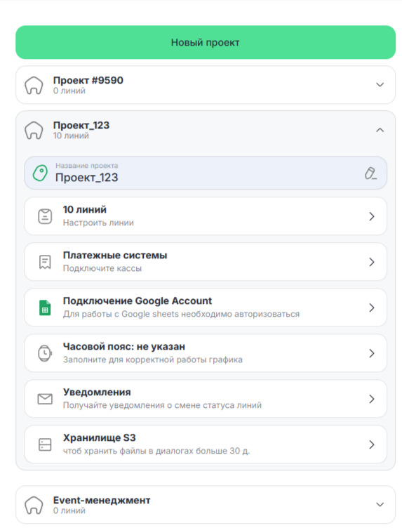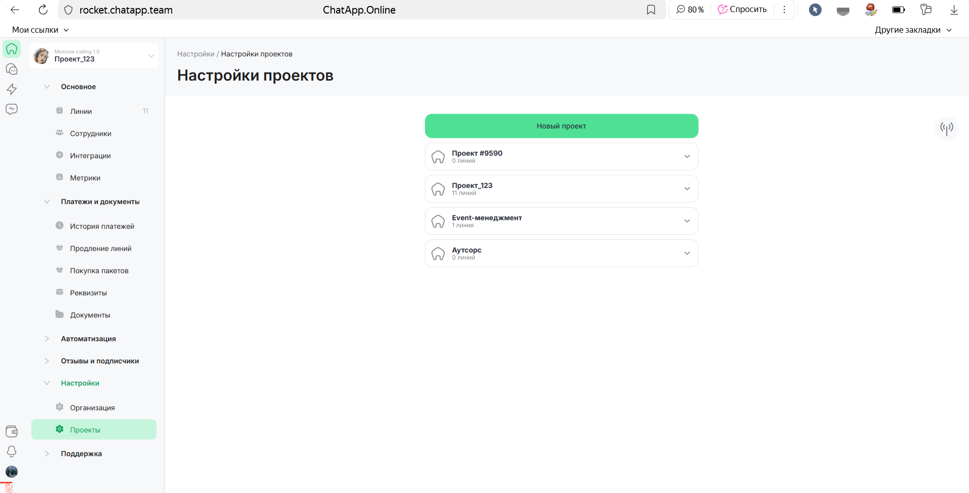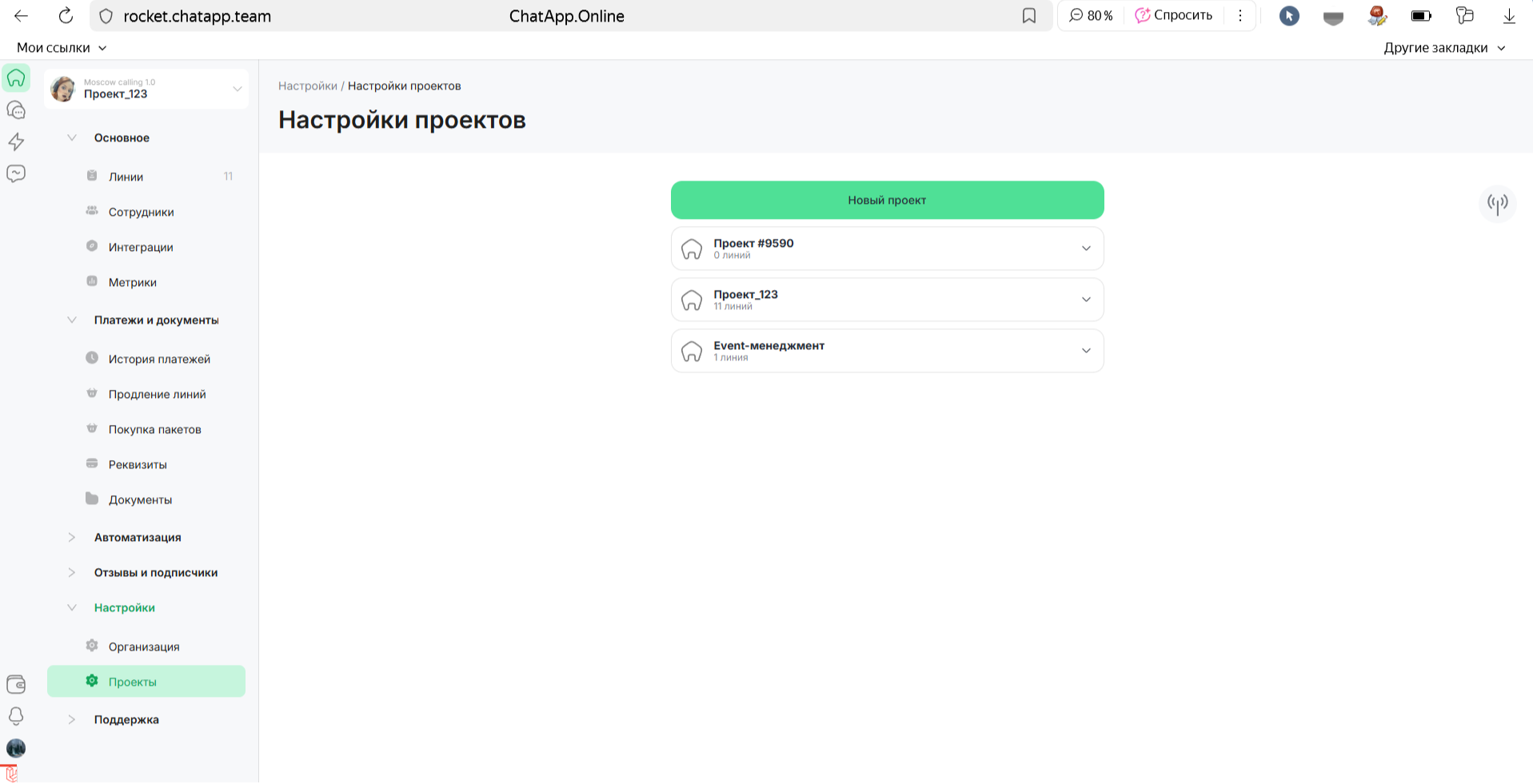 Проект – подраздел Организации. Представляет собой отдел внутри Организации с настройками линий, сотрудников, интеграций, метрик.Как создать проект