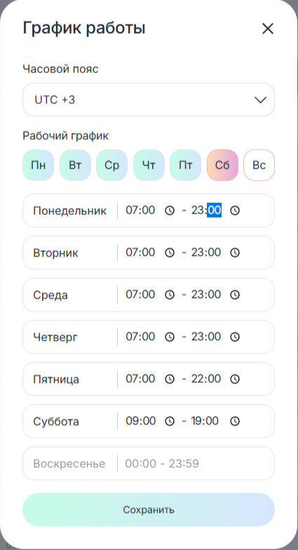 Укажите часовой пояс и заполните расписание работы Проекта по дням недели.