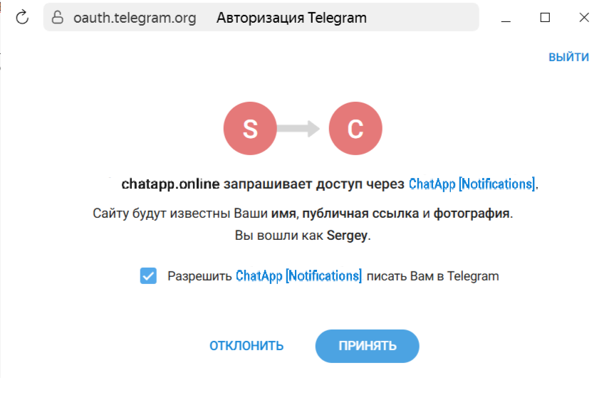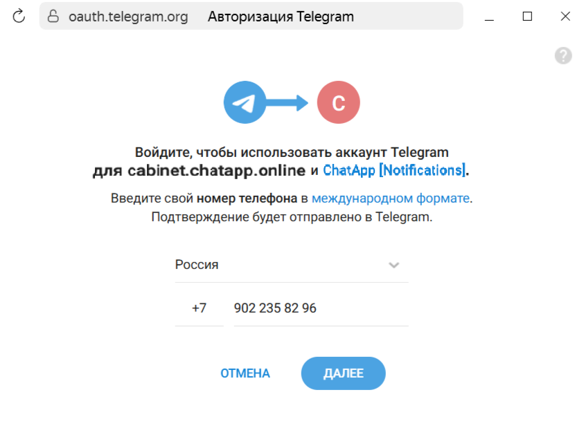 c) Введите номер телефона аккаунта и нажмите на кнопку «Далее». d) Вам поступит сообщение в мессенджер. Подтвердите согласие на авторизацию вашего аккаунта в ChatApp или отклоните. e) В открывшемся окне разрешите доступ ChatApp к имени, публичной ссылке и фотографии вашего аккаунта или отклоните запрос.