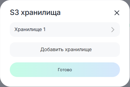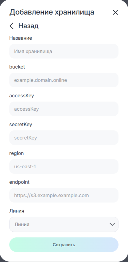 • Название — имя хранилища. • bucket — имя бакета. • accessKey — идентификатор ключа, который можно получить при генерации статического ключа. • secretKey — секретный ключ, который можно получить при генерации статического ключа. • region — значение региона. • endpont — URI хранилища, с которым вы будете работать. • Линия — в выпадающем списке выберите активную авторизованную линию, для которой привязываете хранилище.