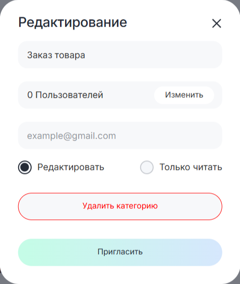 1). Вы можете при необходимости пригласить сотрудников, которые смогут редактировать быстрые ответы этого раздела. Для этого введите в поле email сотрудника, установите для него право "Редактировать" или "Только читать" и нажмите на кнопку «Пригласить». 2). Вы можете изменить права приглашенного сотрудника. Для этого нажмите на кнопку «Изменить».