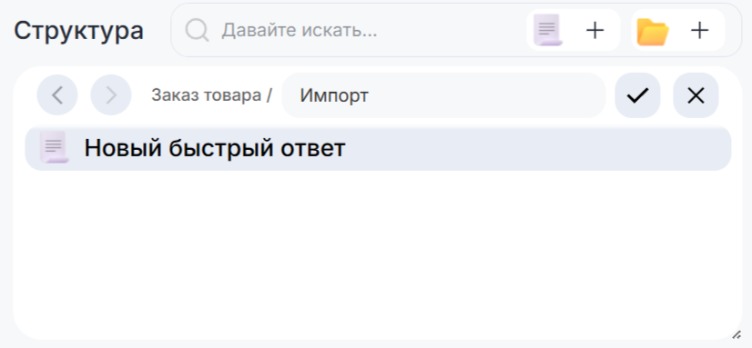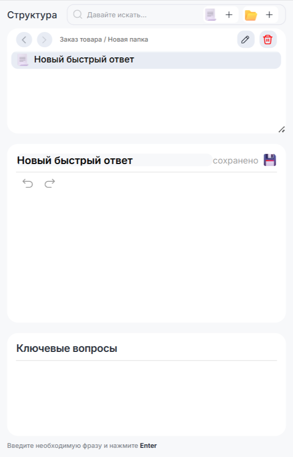 В области "Новый быстрый ответ" введите ваш текст ответа и нажмите значок дискеты, чтобы сохранить его.