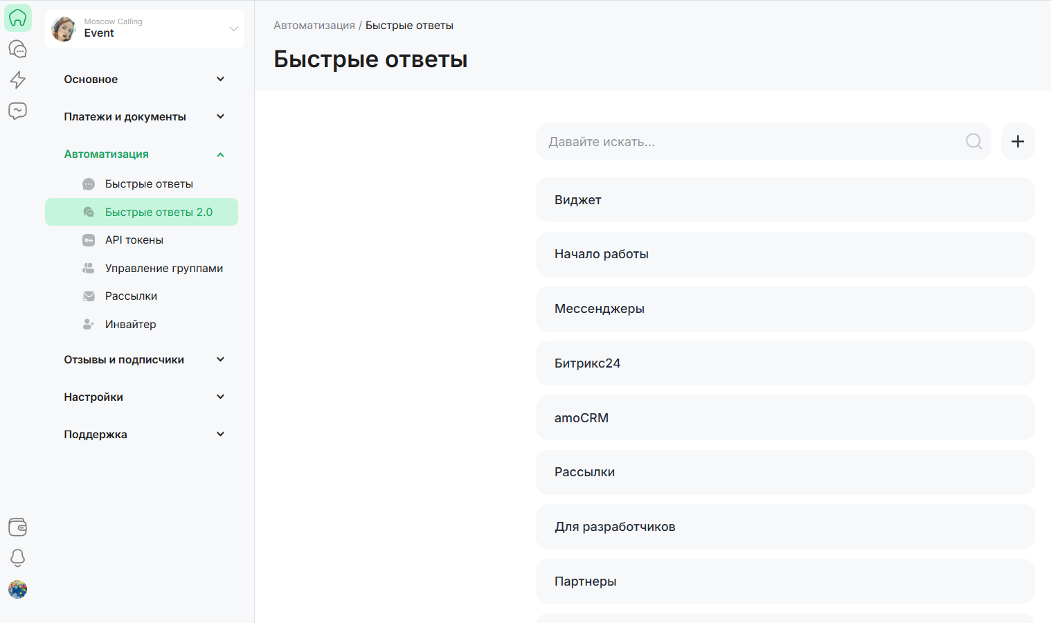 Быстрые ответы помогают оптимизировать работу операторов, быстрее отвечать клиентам и создавать базу знаний внутри компании.1. В левом меню своего Личного кабинета выберите раздел "Автоматизация". 2. Нажмите на вкладку «Быстрые ответы 2.0».