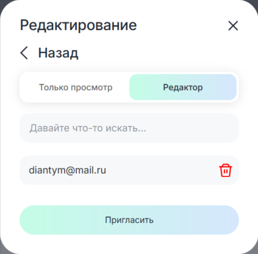 Для поиска приглашенного сотрудника введите в поле его email и/или установите права сотрудников, список которых вы хотите просмотреть. Если приглашенных сотрудников еще нет, список для поиска будет пустой.