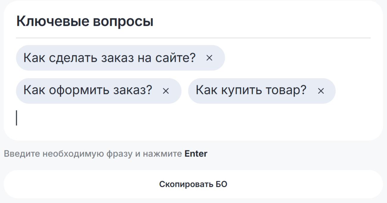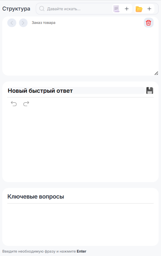 7. После сохранения быстрого ответа добавьте ключевые вопросы к нему. При настроенной автоматизации, на такие поступившие от клиентов вопросы система будет отправлять этот быстрый ответ. После написания каждого вопроса, нажмите клавишу «Enter», чтобы добавить его в раздел.