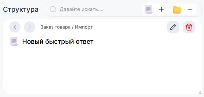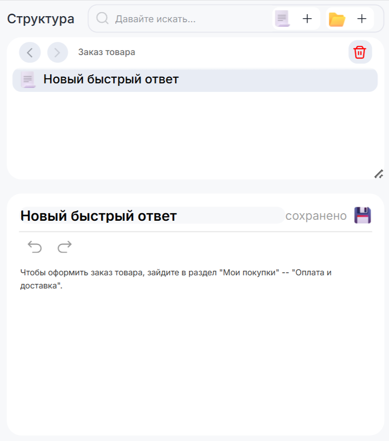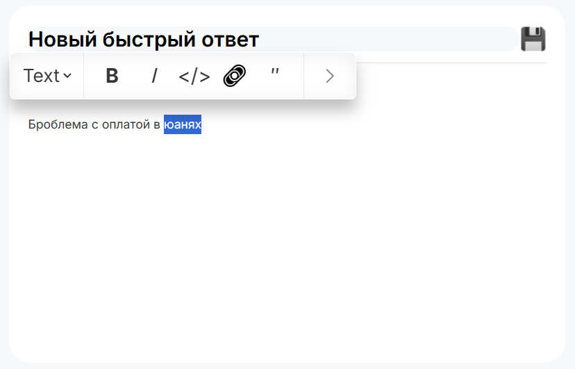 В области "Новый быстрый ответ" введите ваш текст ответа и нажмите значок дискеты, чтобы сохранить его.