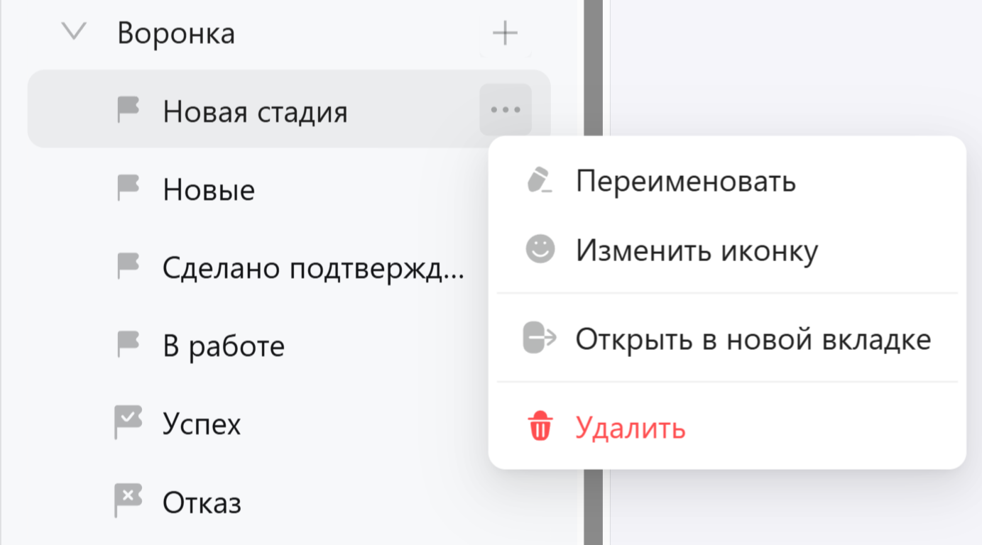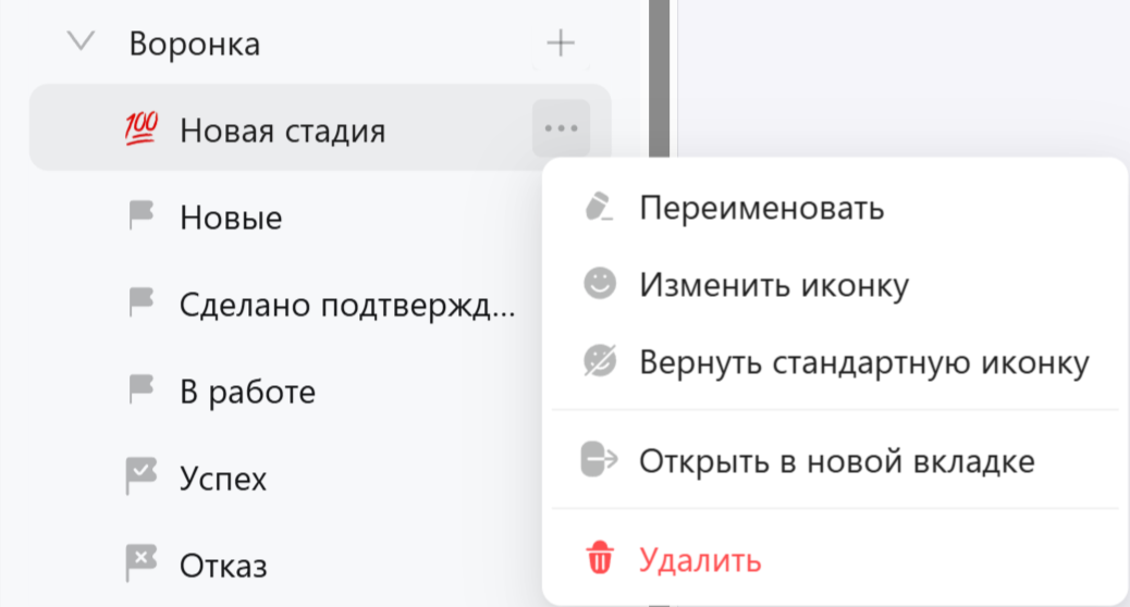 Для редактирования стадии наведите на нее курсор и нажмите на 3 точки справа, откроется меню: