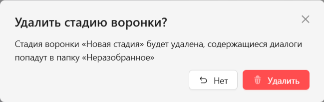 При подтверждении стадия будет удалена из списка. Для диалогов с этой стадией будет установлена стадия по умолчанию - "Неразобранное".