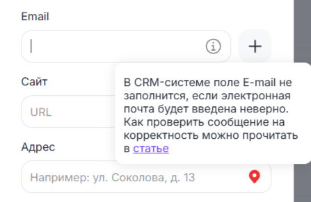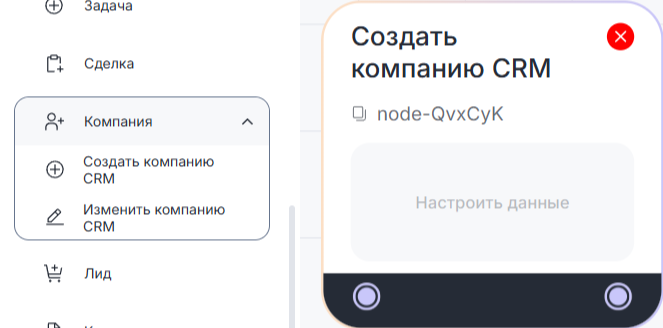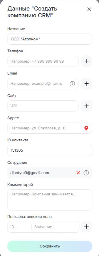 Блок «Создать компанию CRM» позволяет автоматизировать создание компании в CRM-системах. Блок способен создавать компании в следующих CRM-системах: 1. Перейдите в Редактор сценариев и добавьте блок «Создать компанию CRM» в рабочую область.   2. Нажмите на поле «Настроить данные».   3. В открывшемся окне заполните все поля создаваемой компании. В поля можно добавить переменные. Подробнее о создании переменных читайте в статье "Переменные и константы". Поле email заполните с учетом правил заполнения адреса. Как заполнить поле корректно -- читайте в статье "Регулярные выражения".   4. Нажмите на кнопку «Сохранить». 5. Поместите блок «Создать компанию CRM» в сценарий и соедините с другими блоками. Теперь когда сценарий дойдет до этого блока, в CRM-системе будет создана компания.