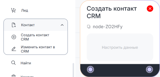 | Важно: блок «Создать контакт CRM» только создает элемент, он не может проверить наличие такого контакта в CRM. | |