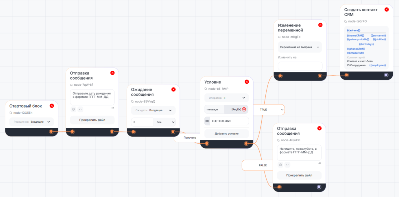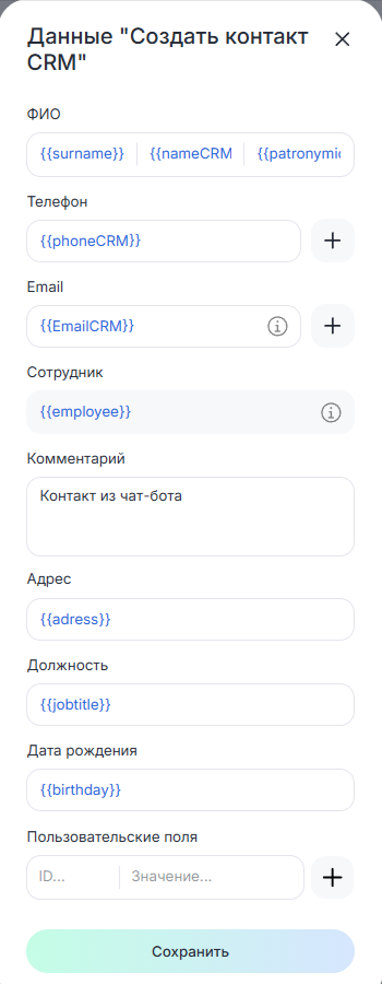 Рассмотрим пример использования блоков CRM. Например, чтобы в нерабочее время бот собрал данные клиента и добавил их в CRM-систему в виде карточки «Контакт».