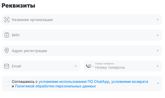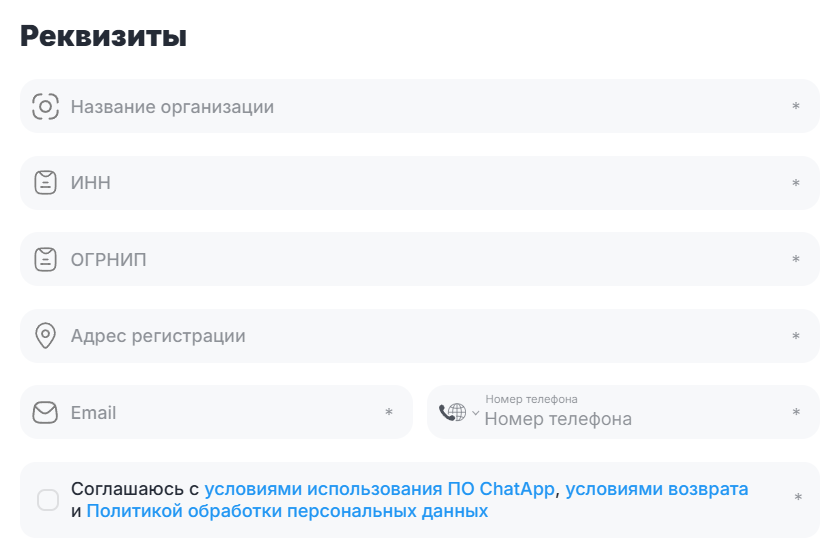 Ознакомьтесь с условиями использования ПО ChatApp, условиями возврата, Политикой обработки персональных данных и подтвердите согласие, установив соответствующую отметку.