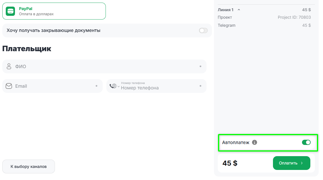 Включите переключатель «Автоплатёж», чтобы разрешить регулярные списания без ручного подтверждения.