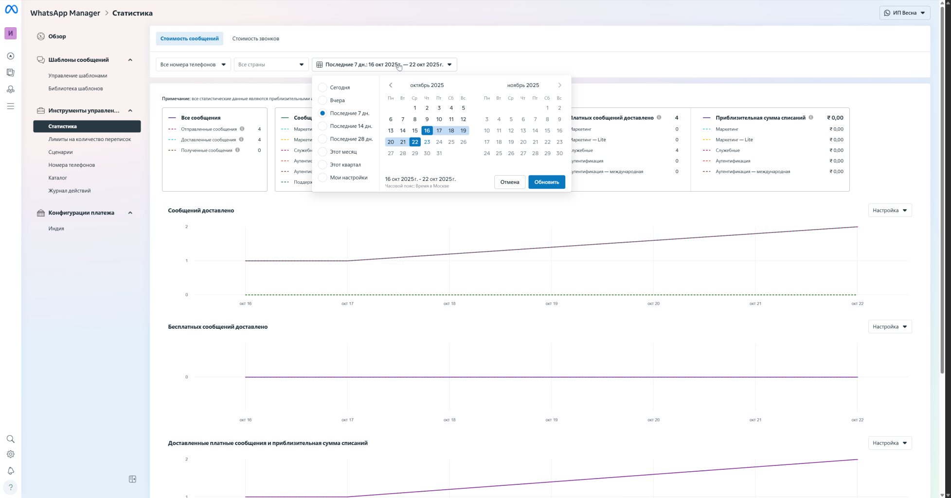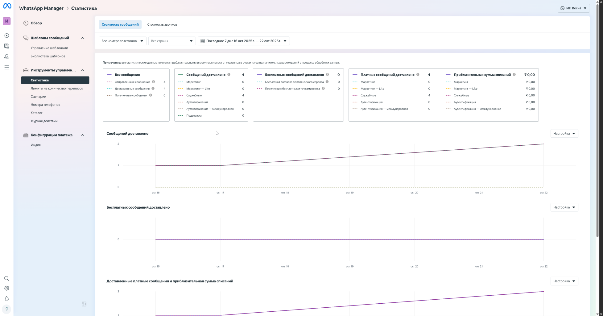 2. Нажмите на кнопку «WhatsApp Manager». В разделе "Статистика" отобразится вся информация по вашим сообщениям.