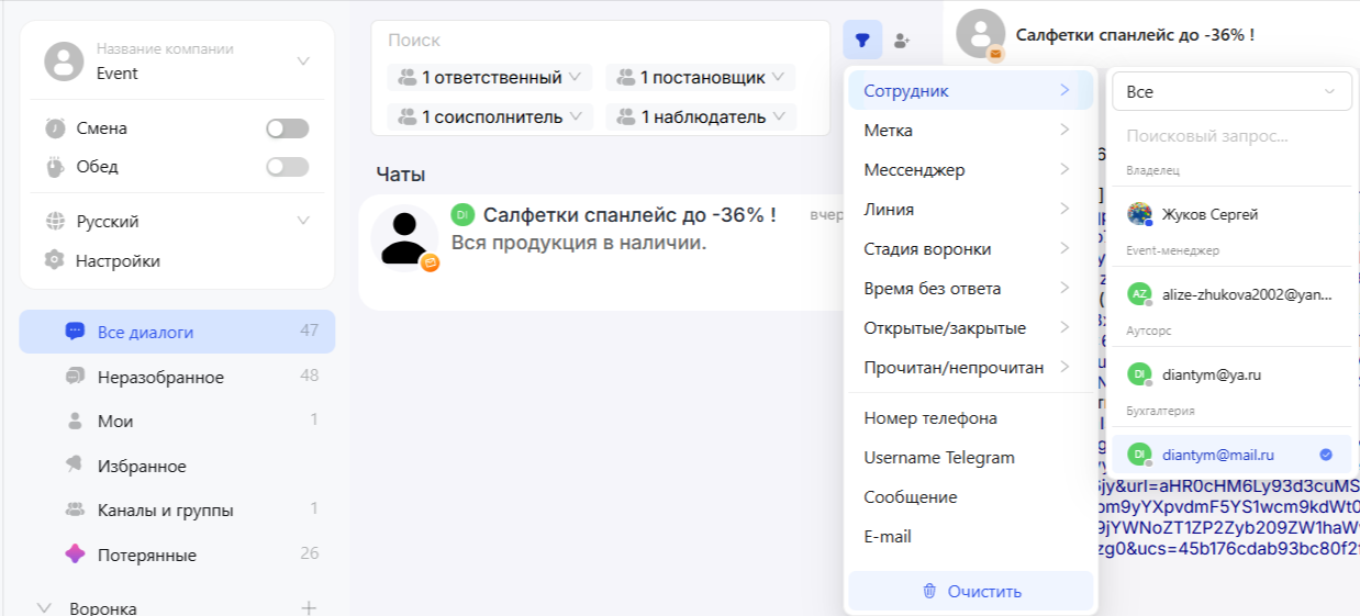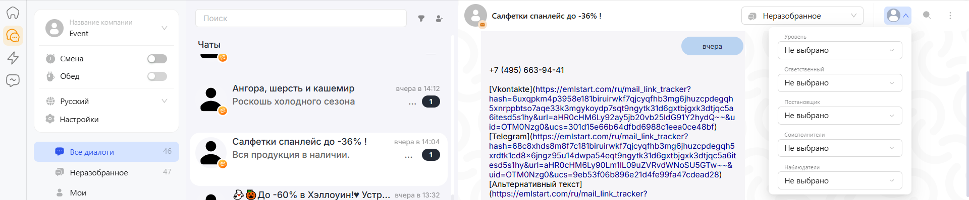 Назначение на позицию позволяет находить диалоги, которые сотрудник ведет в качестве участника. Для этого применяется система фильтров.