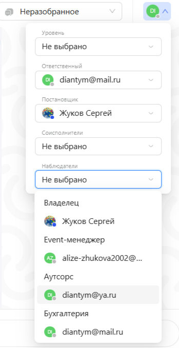 Особенности назначения Позиций участников. 1. В диалоге может быть только один Ответственный и один Постановщик, Соисполнителей и Наблюдателей может быть несколько. Один сотрудник может одновременно относиться к нескольким позициям участников диалога. 2. На позицию ответственного может назначаться сотрудник сразу при начале диалога. В процессе диалога на всех позициях сотрудники могут назначаться, изменяться и удаляться. 3. Назначенный на позицию сотрудник имеет доступ к чатам в соответствии с настройкой его роли в системе.
