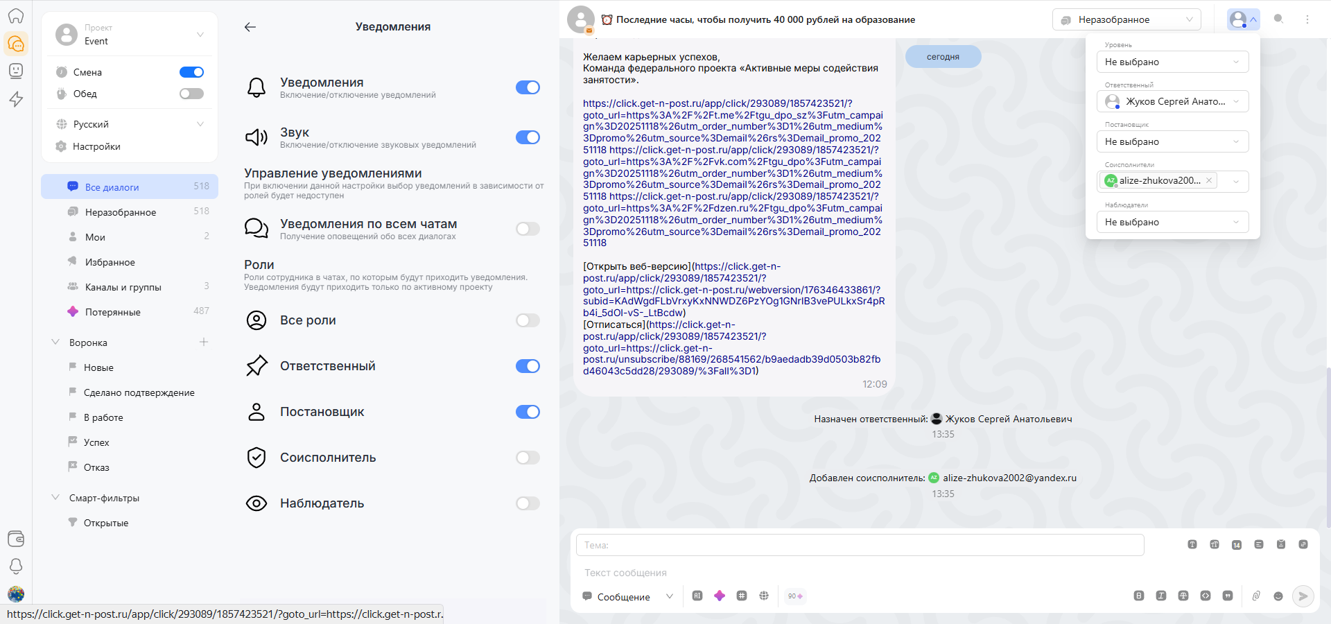 При первом включении уведомлений по умолчанию используется настройка по ролям. Настройка «Уведомления по всем чатам» не активируется автоматически и может быть включена вручную. 3. Укажите нужные роли сотрудника в чатах, по которым будут приходить уведомления.   Например, при выборе роли «Ответственный» уведомления будут приходить по тем чатам, где эта роль установлена. Чтобы установить роль сотрудника в диалоге: