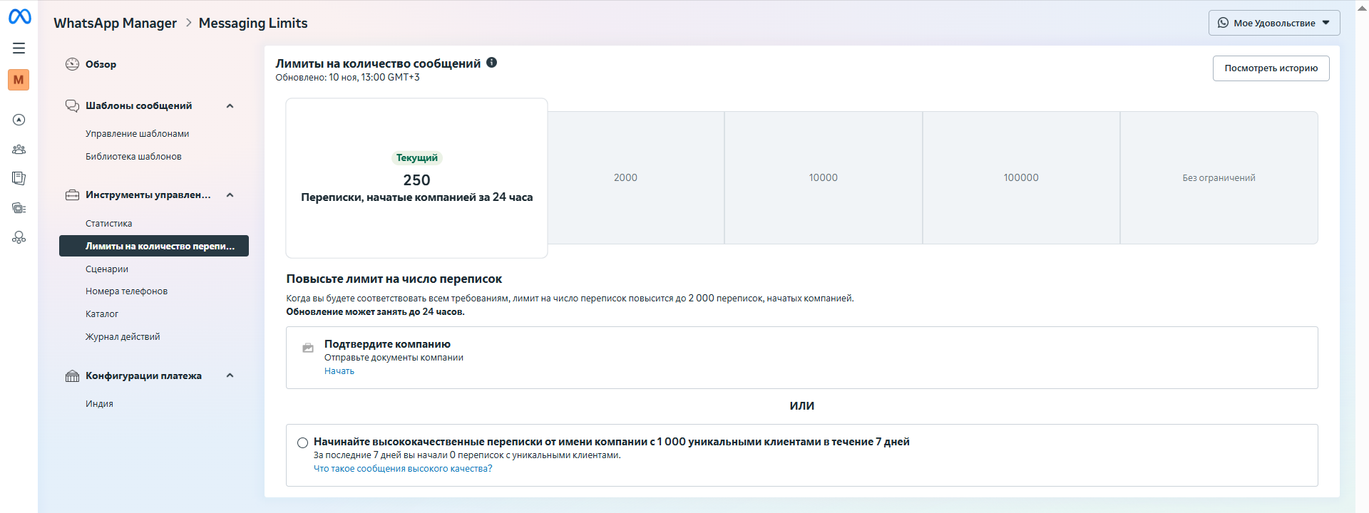 - Если номер подключен до 7 октября 2025 и имеется лимит в 1000 сообщений, то для того, чтобы поднять лимит до 2000, необходимо подключить новый номер в этом же бизнес-портфолио.
