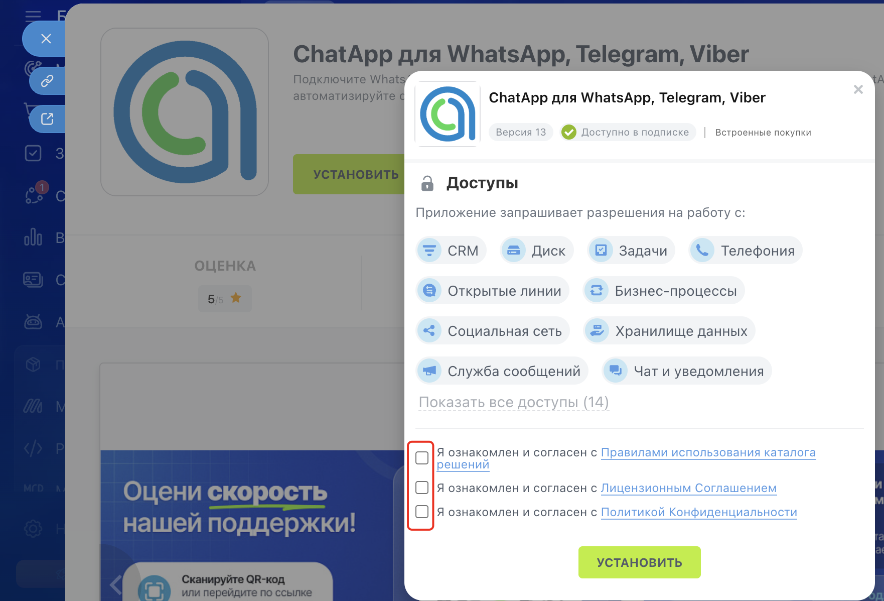 Если Маркетплейс не активирован, система предложит включить, после чего вы сможете продолжить установку ChatApp.