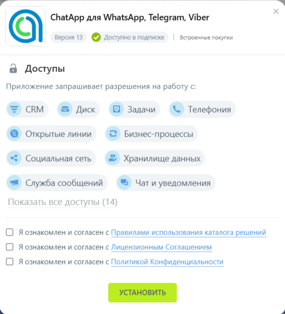 Для дальнейшей работы с сервисом нужно подключить каналы ChatApp в Открытую линию Битрикс24. Как это сделать — читайте в статье “Подключение каналов“.