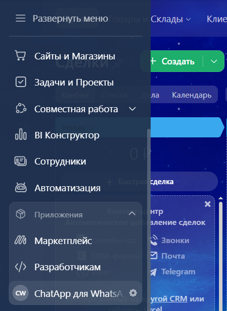 6. Выберите «Приложения» — «ChatApp» в левом меню Битрикс24.