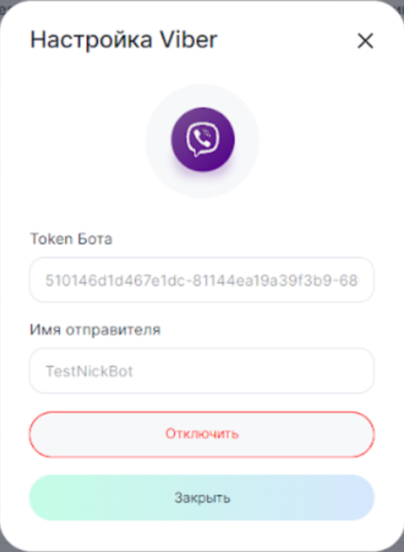 После успешного подключения отобразится имя отправителя и токен бота. Вы можете отключить Viber Bot, нажав на кнопку «Отключить».