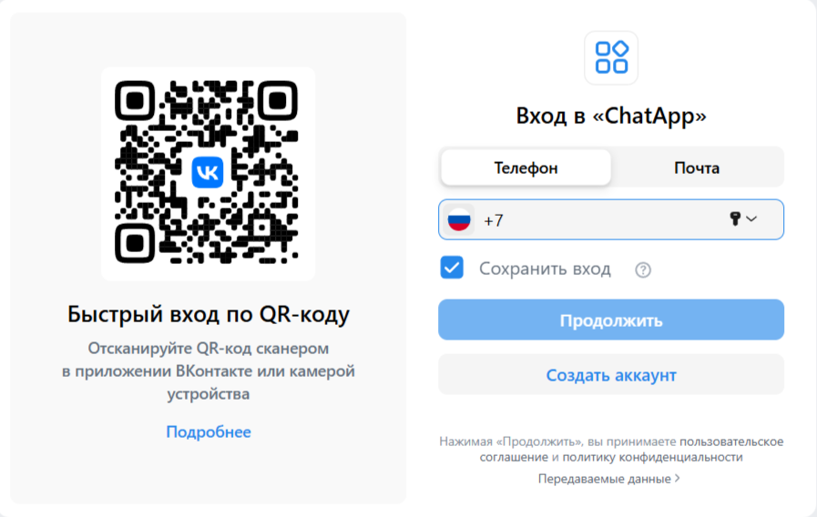 3. Введите номер телефона или email для входа в ChatApp для подключения аккаунта VK.