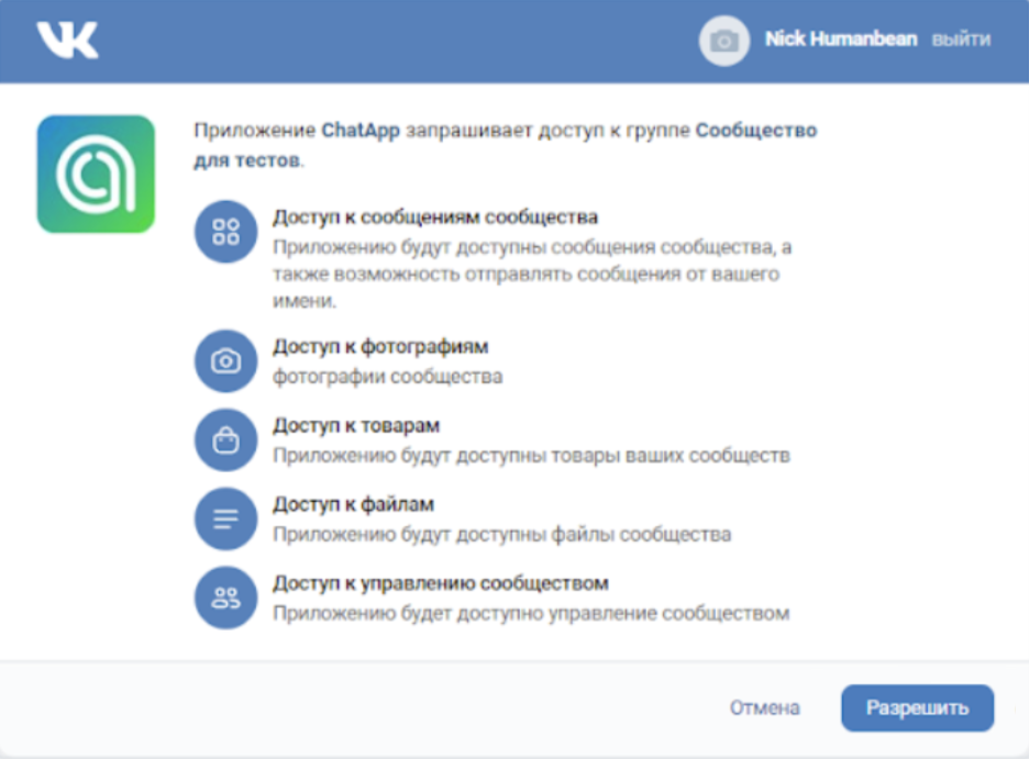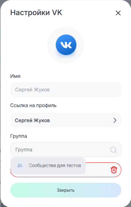 Откроются настройки подключения. Здесь вы можете увидеть имя пользователя, перейти на профиль по ссылке и указать группу, в которой профиль является администратором, если сообщество создано в VK.