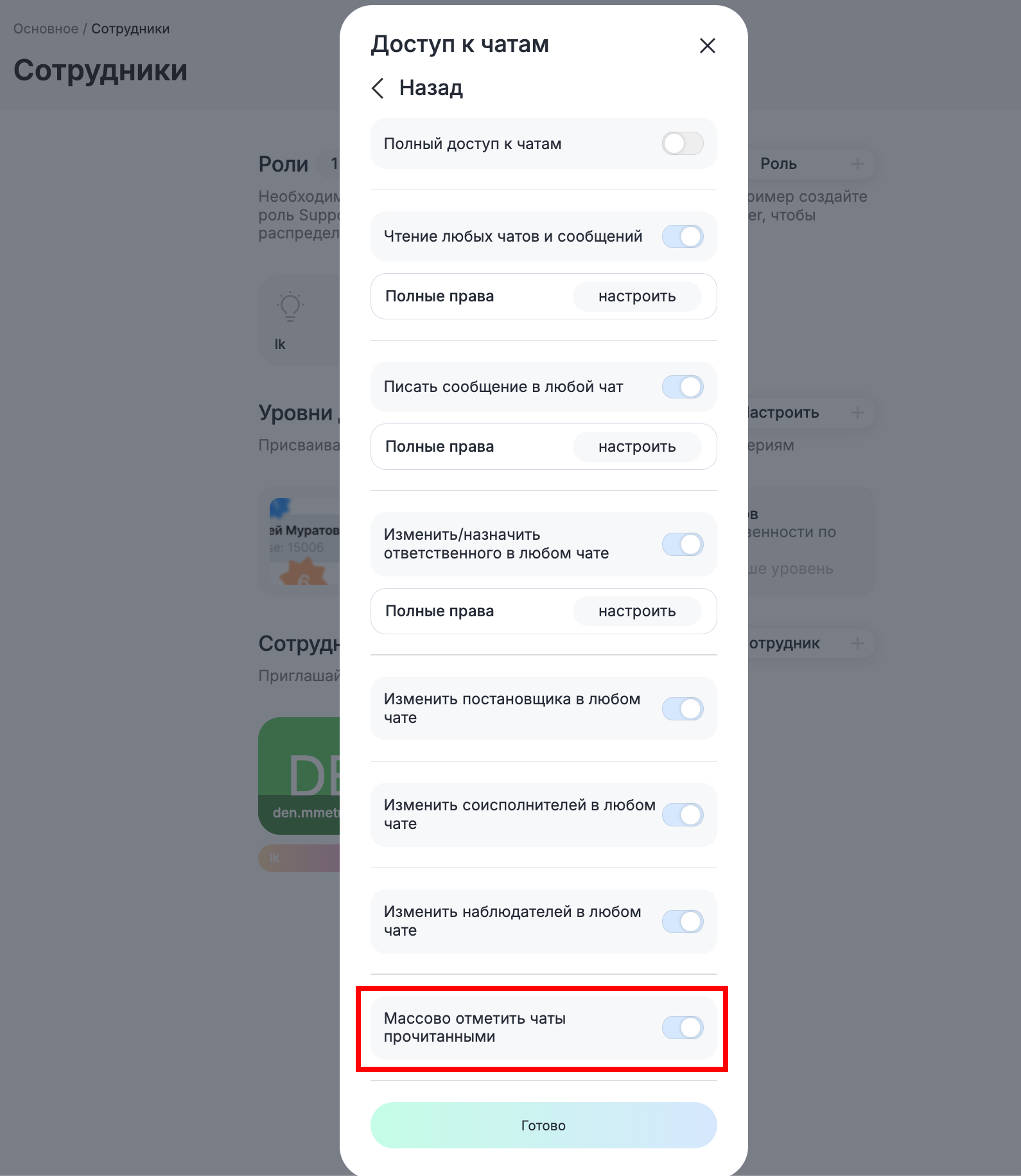 Чтобы сотрудники компании могли также использовать эту опцию, необходимо в настройках роли в Личном кабинете включить настройку “Массово отметить чаты прочитанными”, иначе кнопка в Dialogs для сотрудника отображаться не будет: