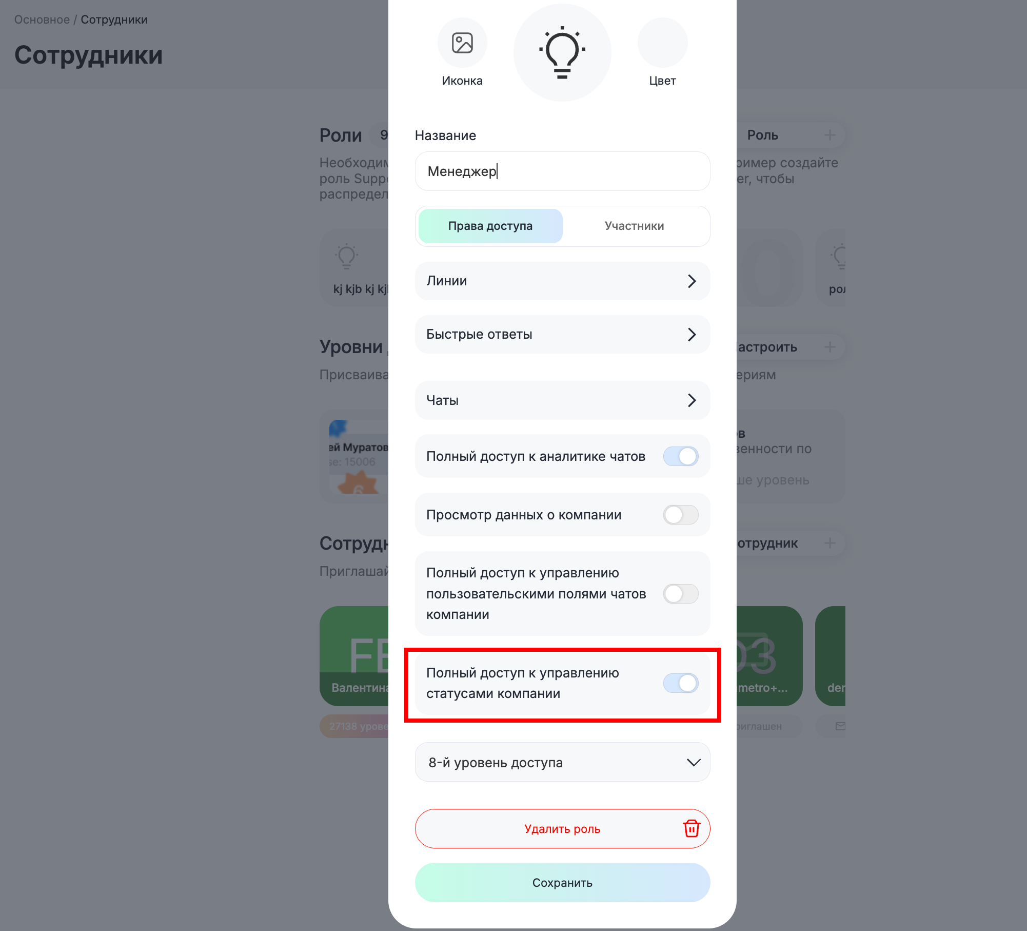Для того, чтобы сотрудники компании могли создавать и редактировать стадии воронки, необходимо включить опцию “Полный доступ к управлению статусами компании” в настройках роли в Личном кабинете: