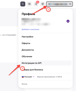 1. Нажмите на ФИО в правом верхнем углу → в разделе профиль → перейдите в раздел “Интеграции по API”.