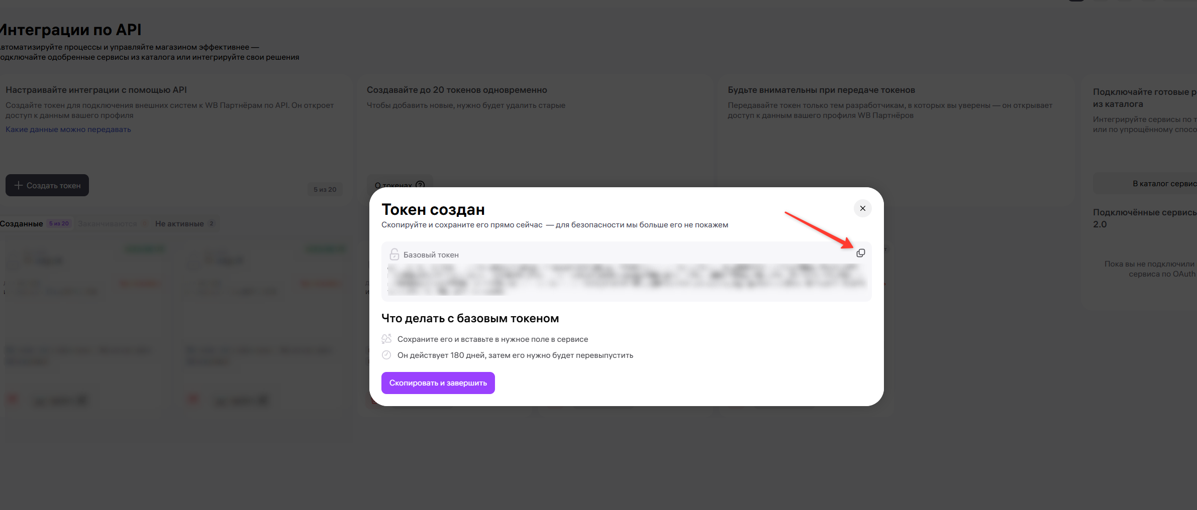 Скопируйте токен, он понадобится при подключения Wildberries в ChatApp