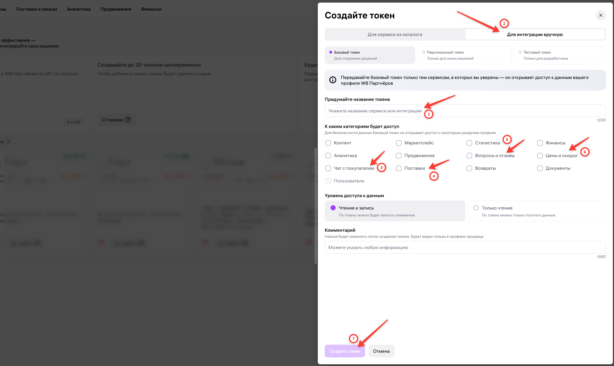 2. Нажмите “Создать токен” → необходимо вести данные: Выберите раздел “Для интеграции в ручную” → введите название токена, например “Интеграция с ChatApp” → выберите категории: