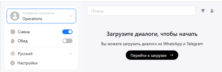 Модуль Dialogs.Pro позволяет загрузить историю чатов из Telegram и WhatsApp, чтобы продолжать диалоги с клиентами в едином окне, сохраняя старую переписку. Для пользователей, у которых в системе ещё нет чатов в текущем Проекте, кнопка «Перейти к загрузке» будет доступна сразу из списка диалогов.