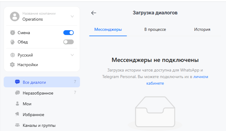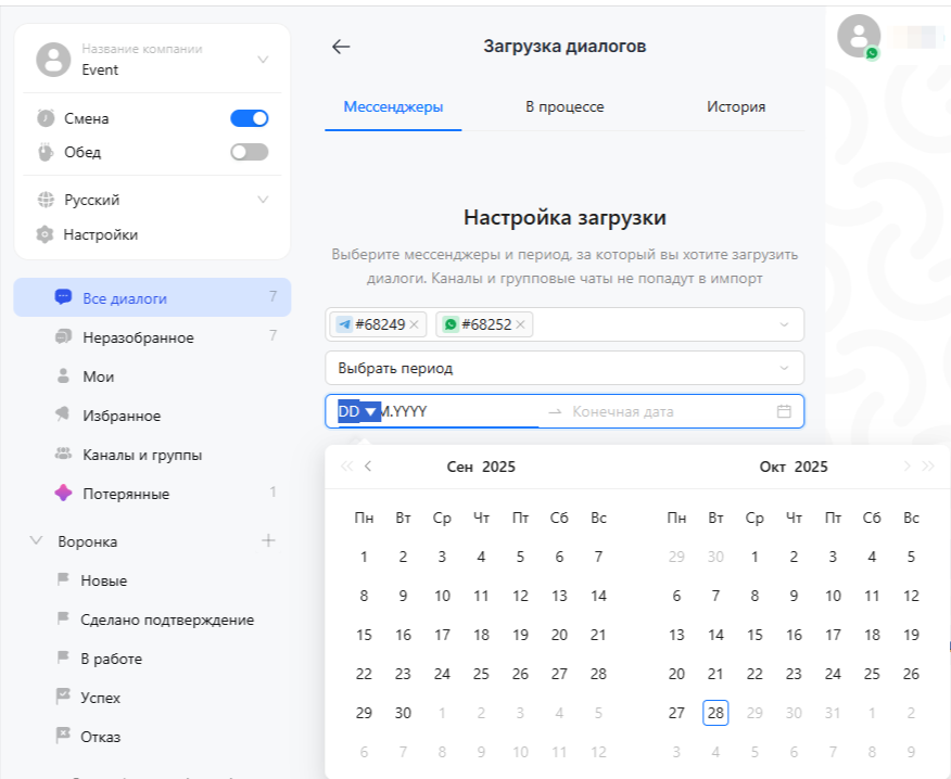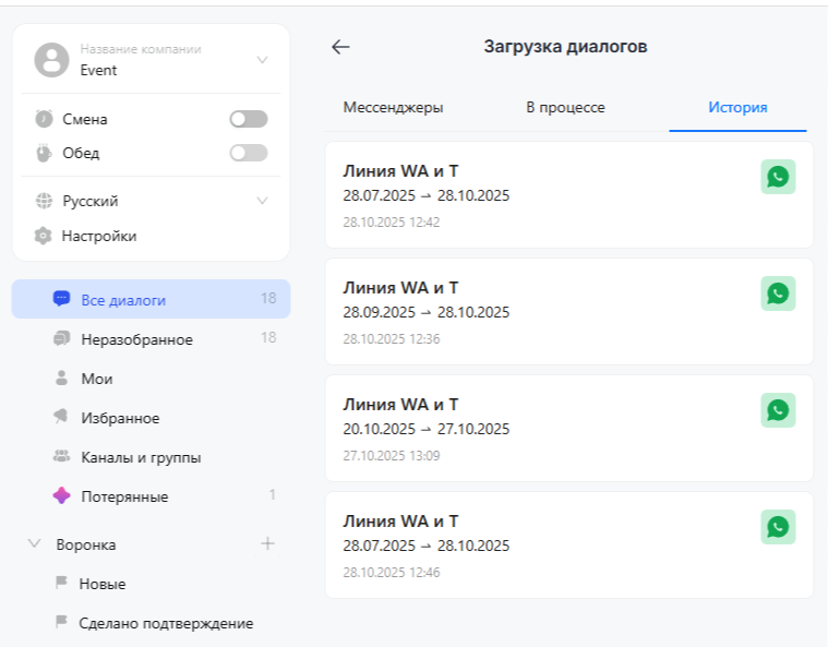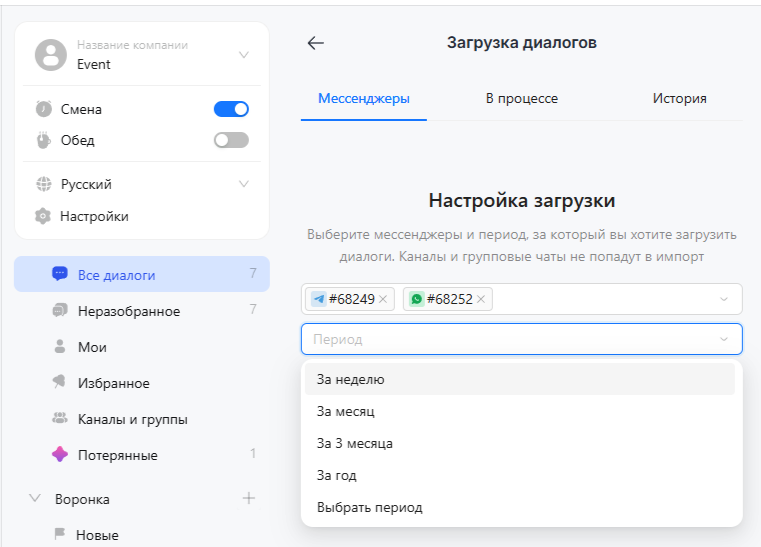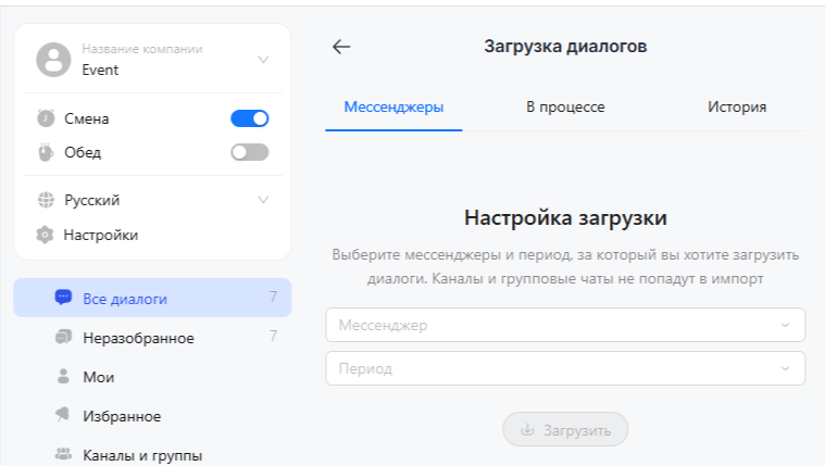 • Мессенджеры – настройка импорта по WhatsApp и Telegram, выбор периода и подключенных аккаунтов. • В процессе – список всех активных импортов. Здесь можно остановить или отменить загрузку. • История – список завершённых импортов: успешных, с ошибками или без новых сообщений. Доступна кнопка «Перезапустить» для неудачных импортов.