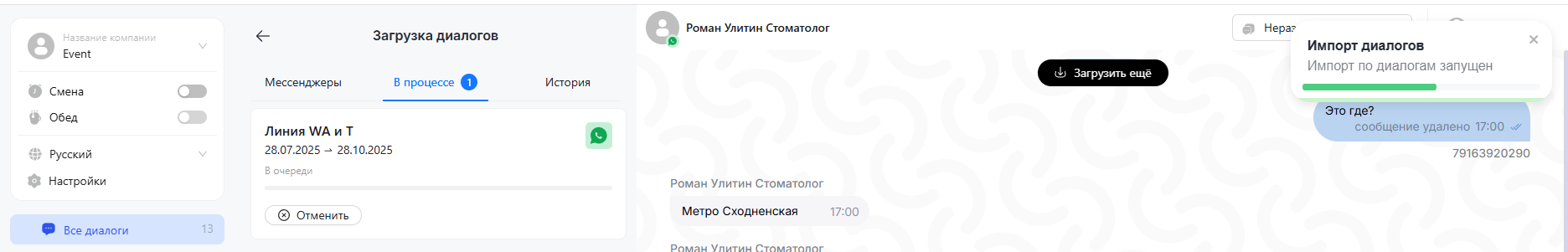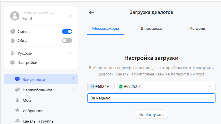 Если у вас в Dialogs уже есть чаты и вам требуется загрузить переписку с клиентом, нажмите в левом меню на строку "Настройка", затем перейдите в раздел "Загрузка диалогов".
