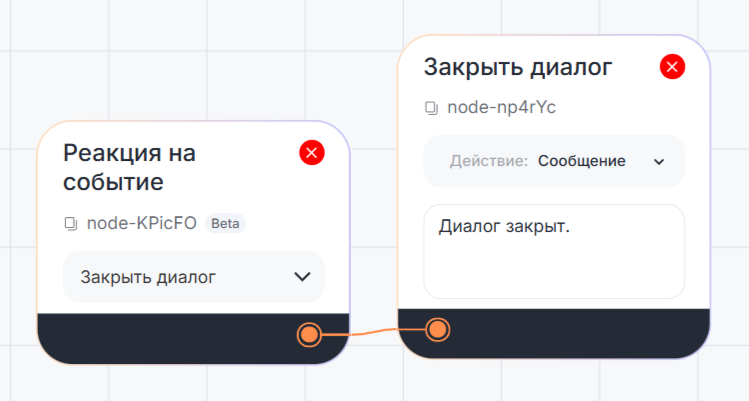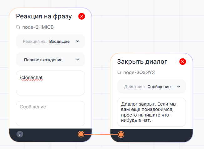 3. Создайте блок «Закрыть диалог» и привяжите его после «Реакции на фразу».