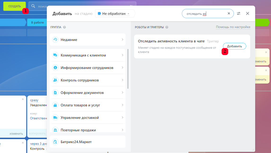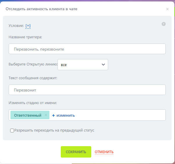- Триггер реагирует, когда текст сообщения Клиента содержит слово «Перезвонит» и перемещает сделку на стадию, где находится триггер.