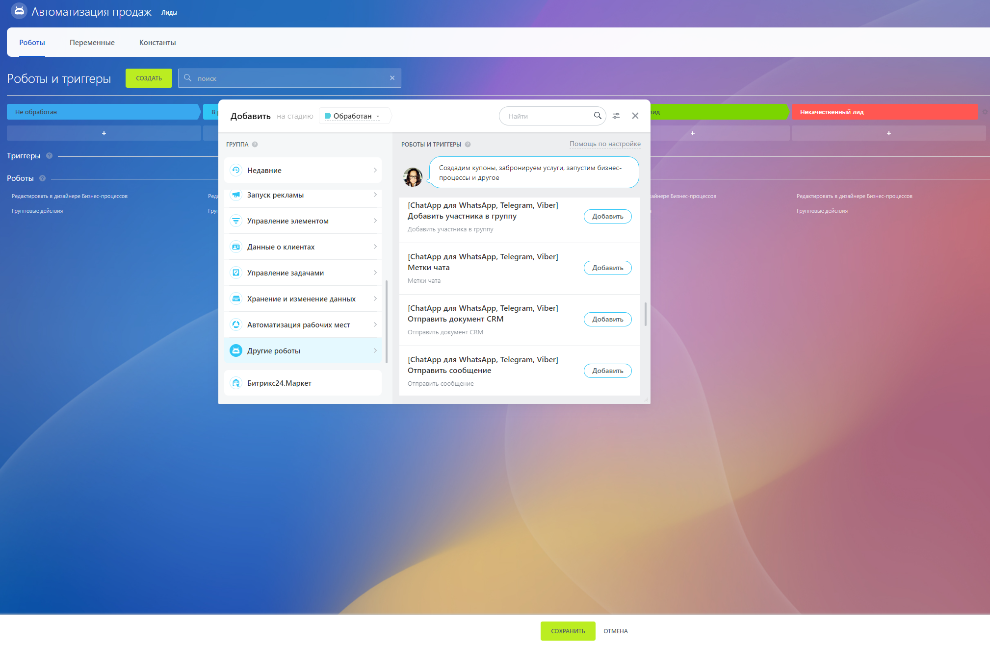 - Отправить сообщение в мессенджер на определенной стадии сделки;